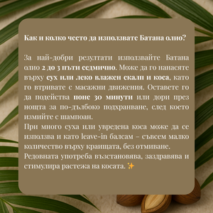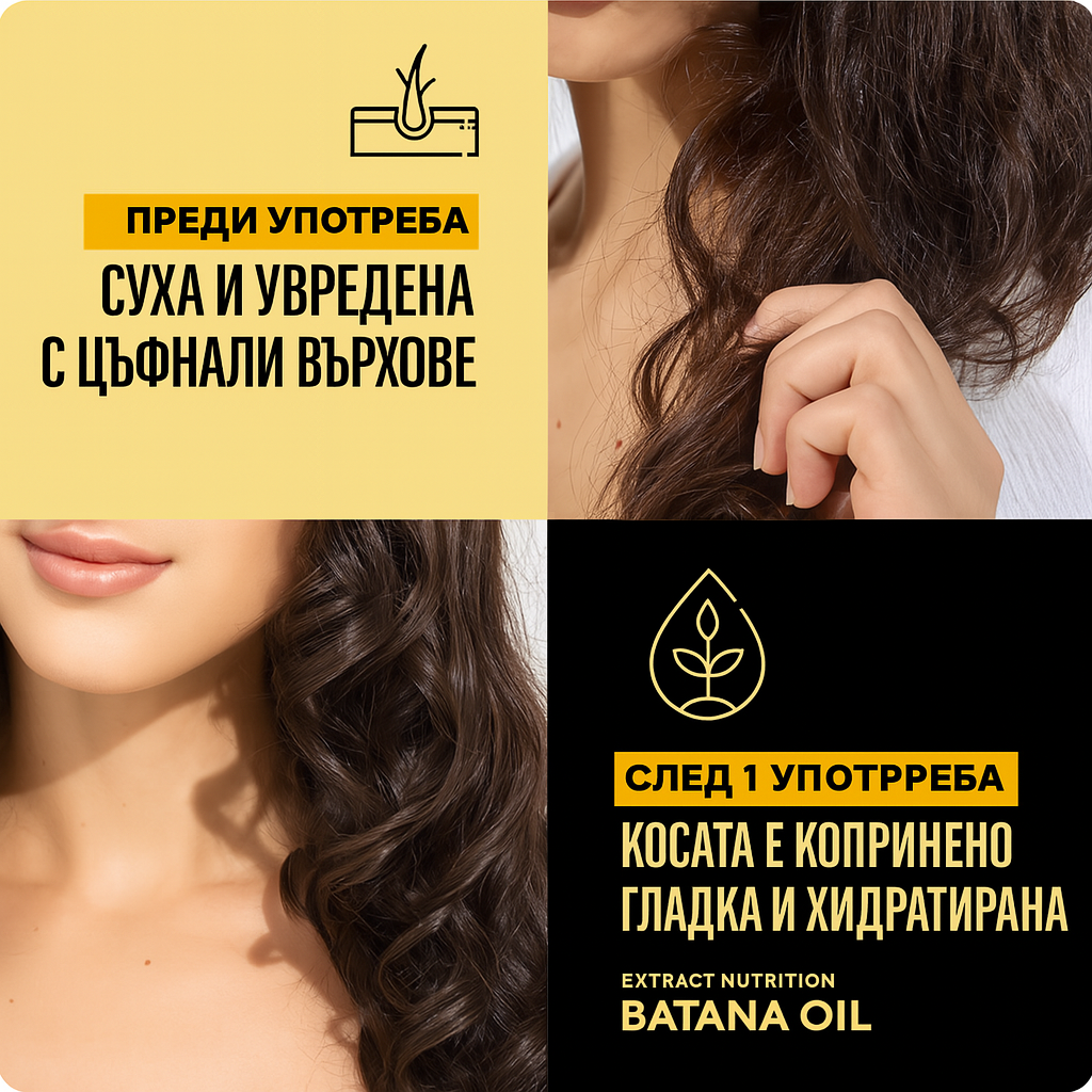 Батана олиото се добива ръчно от ядките на палмата Elaeis Oleifera в тропическите гори на Хондурас и се използва от повече от 1000 години от народа на Мискито – известни още като "тази с косата до земята" заради изключително дългата и здрава коса, която поддържат.